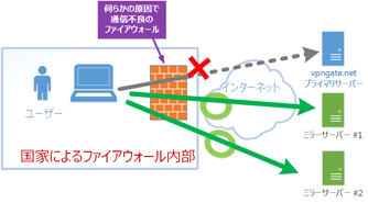 しかしながら、世界にあるいくつかの国・地域では、政府が運営するファイアウォールが海外のインターネット回線との間に存在するようです。そして、それらのファイアウォールはときどき原因不明の故障が発生し、ある特定の